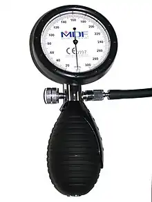 A sphygmomanometer (/ˌsfɪɡmoʊməˈnɒmɪtər/ SFIG-moh-mə-NO-mi-tər), a.k.a. a blood pressure monitor, or blood pressure gauge, is a device used to measure blood pressure, composed of an inflatable cuff to collapse and then release the artery under the cuff in a controlled manner,[1] and a mercury or aneroid manometer to measure the pressure. Manual sphygmomanometers are used with a stethoscope when using the auscultatory technique.