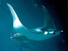The spinetail mobula ray is a large ray which can grow up to a maximal width of 3.1 m (10 ft); average width is 2.3 m (7 ft 7 in).[5][6] Like most rays, it is dorsoventrally flattened and has relatively large triangular pectoral fins on either side of the main body disc. At the front, it has a pair of cephalic fins which are forward extensions of the pectoral fins. These can be rolled up in a spiral for swimming or can be flared out to channel water into the ventral mouth when the animal is feeding.