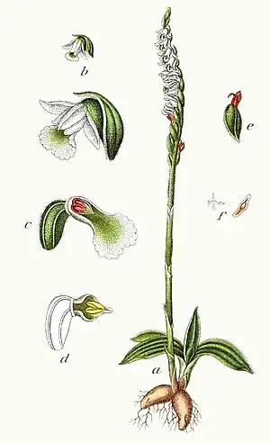 Spiranthes spiralis, commonly known as autumn lady's-tresses,[1] is an orchid that grows in Europe and adjacent North Africa and Asia. It is a small grey-green plant. It forms a rosette of four to five pointed, sessile, ovate leaves about 3 cm (1.2 in) in length. In late summer an unbranched stem of about 10–15 cm (3.9–5.9 in) tall is produced with approximately four sheath-shaped leaves. The white flowers are about 5 mm (0.20 in) long and have a green spot on the lower lip. They are arranged in a helix around the upper half of the stalk. The species is listed in Appendix II of CITES as a species that is not currently threatened with extinction but that may become so. Autumn lady's-tresses are legally protected in Belgium and the Netherlands.