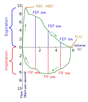 MMEF or MEF stands for maximal (mid-)expiratory flow and is the peak of expiratory flow as taken from the flow-volume curve and measured in liters per second. It should theoretically be identical to peak expiratory flow (PEF), which is, however, generally measured by a peak flow meter and given in liters per minute.[16]