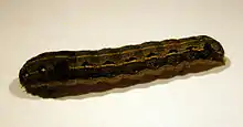 The pupa is around 20 mm long and cylindrical in shape. Initially, the pupa is green colored with reddish abdomen but it turns reddish-brown within few hours. Pupation usually occurs 3–5 cm deep in the solid ground under soil. The duration of pupation is around 5–6 hours.[1][4]