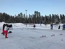 In 1979, Juhani Wahlsten introduced ringette in Finland.[19] Wahlsten created some teams in Turku. Finland's first ringette club was Ringetteläisiä Turun Siniset, and the country's first ringette tournament took place in December, 1980. In 1979 Juhani Wahlsten invited two coaches, Wendy King and Evelyn Watson, from Dollard-des-Ormeaux, a suburb of Montreal, Quebec, Canada, to teach girls of various ages how to play ringette.[20] The Ringette Association of Turku was established in 1981 and several Canadian coaches went there to initiate the training and help establish the sport. The ski national week then organized an annual tournament to bring together all the ringette teams.