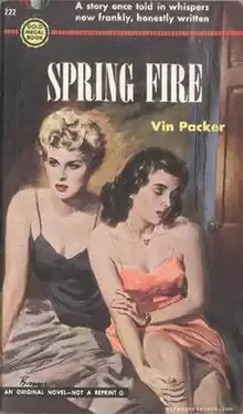 Spring Fire, is a 1952 paperback novel written by Marijane Meaker, under the pseudonym "Vin Packer". It is the first lesbian paperback novel, and the beginning of the lesbian pulp fiction genre; it also addresses issues of conformity in 1950s American society. The novel tells the story of Susan "Mitch" Mitchell, an awkward, lonely freshman at a Midwestern college who falls in love with Leda, her popular but troubled sorority sister. Published by Gold Medal Books, Spring Fire sold 1.5 million copies through at least three printings.