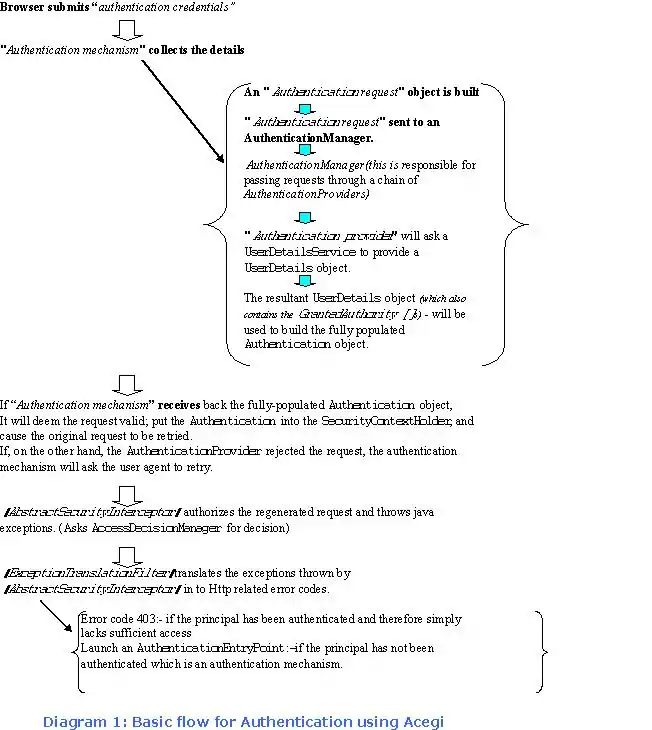 Diagram 1 shows the basic flow of an authentication request using the Spring Security system. It shows the different filters and how they interact from the initial browser request, to either a successful authentication or an HTTP 403 error.