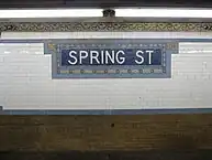 The original decorative scheme consists of blue tile station-name tablets, light blue tile bands, a white terracotta cornice, and light blue terracotta plaques.[38]:33 The mosaic tiles at all original IRT stations were manufactured by the American Encaustic Tile Company, which subcontracted the installations at each station.[38]:31 The decorative work was performed by tile contractor Manhattan Glass Tile Company and terracotta contractor Atlantic Terra Cotta Company.[38]:33 The ceilings of the original platforms and fare control areas contain plaster molding.[38]:10 The station has small "S" cartouches with two poppies from 1904, made by Atlantic Terra Cotta, and large mosaic tablets by Heins & LaFarge, also from 1904. Other small "S" and "Spring St" mosaics are newer.[40]