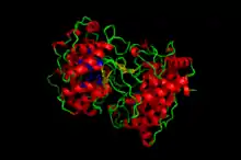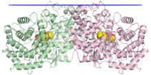 The crystallographic structure of the squalene-hopene cyclase dimer, with the membrane position indicated in blue, the two monomers in green and pink, and a substrate mimetic in the central cavity in yellow.[1]