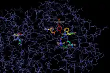 The SHC active site is located in a central cavity within the region of the protein adjacent to the membrane, and is accessed by the substrate via a non-polar channel.[17] The active site is notably surrounded by aromatic residues forming a cavity that comfortably fits the squalene molecule when folded into a productive conformation. The catalytic mechanism uses coupled aspartate and histidine residues to initiate the cyclization reaction by protonating at C3 and deprotonating at C29, proceeding through a discrete series of carbocation intermediates.[1][18] The enzyme can be inactivated by mutation of catalytic aspartates.[19]