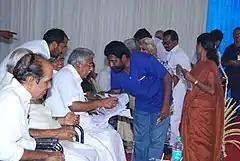 Sathish Kalathil submitting memorandum to Oommen Chandy about S.R.V music school termination