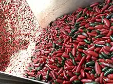 The production of sriracha sauce begins with growing the chilis. The chilis were grown on Underwood Ranch until the two companies ended their relationship in 2016.[28] David Tran, owner of Huy Fong Foods, contracted about 690 hectares (1,700 acres) of farmland that spreads from Ventura County to Kern County in California.[37] The chili peppers are planted in March.[38]