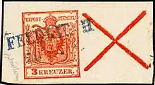 The first St. Andrew's crosses are found on the first Austrian stamp issue from June 1, 1850 printed by the Vienna State Printing Works. They are colored crosses found in place of the last four stamp positions on each sheet as sold to the public.[2][3] Leaving the last four labels free created a problem; the blank labels could be used by forgers to produce counterfeit stamps. For that reason, it was decided to make them unusable by printing the St. Andrew's cross design.