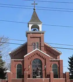 It is a brick "vernacular Romanesque structure featuring buttresses and entry tower".[2]