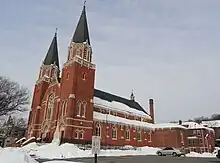 The cornerstone of the present St. Bernard's Church was laid during a ceremony five months after the fire. Shortly thereafter the chapel in the basement was dedicated and used for Mass and other services until the upper church was completed. The new church was dedicated on September 20, 1908.[1]