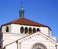 The current Lombard Romanesque church building was built in 1927. It was designed by architect Ross Montgomery.[5] The church is constructed of reinforced concrete with a high altar made of carved French Caen stone.[1] In July 1927, as the structure was being built, the Los Angeles Times reported: