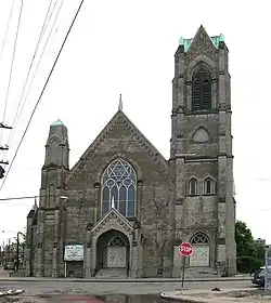 The church was originally constructed in 1874, and was designed by architect Julius Hess.[2] The façade features a large tower on one side and a smaller tower on the other, flanking the entranceway.[2] A large lancet window dominates the façade and a gabled vestibule fronts the gabled entrance. The exterior has been extensively altered from its original appearance. The structure of the church is brick, but in 1915 the exterior was completely covered in Formstone, a cast concrete made to resemble limestone.[2]