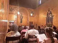 In 1947, The Seven Angels mosaics were added to the church at a cost of $150,000 (approximately $1.55 million in 2022[12]). The figures of the angels, each eight feet high and holding a musical instrument, were made of Italian marble with gold mosaic and stand in arched panels. The mosaics were created in Italy by five artists who spent two years working on them.[13]