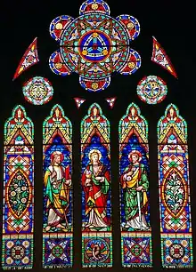 Steady congregational growth necessitated more space. This led to the razing of the first church and the constructing of the current larger stone Gothic building done in the parish church style popular in the 19th century. Emlen T. Littell of New York City designed the building. This church was constructed in 1872 at a cost of $47,000 and consecrated in 1886. It contains several windows from the earlier wooden church, elaborate new stained glass windows imported from Europe, and one—The Parables Window—was designed by Daniel Cottier, who was considered an important influence on Louis Comfort Tiffany.