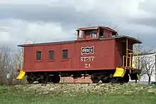 Preserved wooden caboose on display in Missouri
