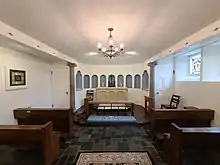 The chapel features elements taken from the Tuxedo Park homes of Richard Mortimer and Henry Morgan Tilford.[96] These include an Italian marble hearthstone taken from Mortimer's since-demolished home "Mortemar" that now serves as the chapel's altar[98] and multiple stained glass fragments that date from possibly as early as the 15th century, at least some of which were taken from the Tilford House. Several of the glass fragments are estimated to date from the 16th century.[99] The chapel was renovated in 2015.[43]