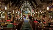 Although the church was originally designed with separate entrances for village residents and those who lived in the Town of Tuxedo, the latter entrance was ordered locked by the Reverend Merrill soon after his arrival at St. Mary's in 1894: it was never used again.[86] More modifications came when the church was significantly expanded starting in 1897, with the addition of a further arch to the nave, a transept and a choir aisle.[66] The final major alteration to the church's structure was the installation of the western aisle in 1904.[87] A major aesthetic alteration occurred in 1922, when Isabelle Weart Giles arranged to have the church's sanctuary redesigned by the noted Gothic Revivalist architect Bertram Goodhue in honor of her late husband, Henry Morgan Tilford.[43][22] Celebrated architectural sculptor Lee Lawrie contributed an alabaster and gold panel to the reredos as part of the redesign.[88] An altar dedicated to St. Mark was installed at the foot of the western aisle in 1955, located in front of the since-replaced Hutchings-Votey organ given in honor of U.S. Representative and Tuxedo resident John Murray Mitchell.[89]