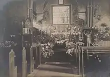 Several sources attest to the extensive decorations that accompanied the era's weddings at St. Mary's. Parts of the church's nave and sanctuary, including the aisles, pews, altar and columns, were decorated with a wide variety of seasonal and imported foliage;[23] examples include palms, lilies, peonies, holly, roses, dogwood, ferns, fruit blossoms, dahlias, gladioluses, snapdragons, forsythia and syringa.[24][25] Arches were covered with woodland foliage and laurel, while the rafters were filled with branches of balsam.[26][27][28] On one occasion a wedding bell formed from white roses was hung from a central arch in the nave.[29] A wedding gown first worn in 1768 and later worn by Julia Thorne at her 1970 marriage to John Kerry[30] was worn by Julia Loomis Thorne, Alfred Lee Loomis's sister, at her St. Mary's wedding in 1911.[31] The gown was once described by the New York Times as being "perhaps the most notable wedding gown in existence in this country".[31]