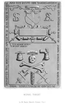 - "Here lies interr-d the bodie of James Sandelands, marchant, in Upland, in Pennsylvania, who departed this mortal life, Aprile the 12, 1692, aged 56 years, and his wife, Ann Sandelands"[6]: 12–13