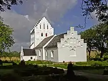 According to America's Architectural Roots: Ethnic Groups that Built America, most Danish Lutheran Churches for which Danish-American communities are known are designed in a variant of the High Victorian Gothic style. St. Peder's Church is one of few in the United States which displays the square entrance tower and stepped gables of the Dutch style prominent in the 15th and 16th century Danish ecclesiastical architecture. The design is indicative of the traditional village churches of their homeland, with numerous stepped gables and prominent towers. Incised decorations such as the blind roundel, while not elaborate on this example, are reminiscent of the blind colonnades of the original examples in Denmark. The stylistic details of St. Peder's are particularly similar to the churches in Asperup and Landet in Denmark [photos included].[2]