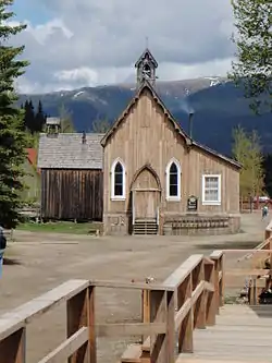 St. Saviour's Anglican Church is an historic one-storey rustic Carpenter Gothic Anglican church building located in the National Historic Site of Barkerville, British Columbia. Designed by the Rev. James Reynard, it was built by John Bruce and J. G. Mann. Construction began in 1868 but was not finished until after the church's first service was held on September 18, 1870. Its Carpenter Gothic architectural features include lancet windows and board and batten walls on the exterior as well as interior. A porch on the right side which appeared in early photographs is no longer in existence.[1] Today it is part of Barkerville Historic Town and admission to the church is included in the price of admission to the town. Lay services are conducted in the church most days during the summer season. [2] [3] [4]