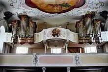 It is assumed that he based the interior design on the Buxheim parish church, which was decorated by the Zimmermann brothers. The three altars (high altar, Lady altar and Joseph altar) and the pulpit were created under the influence of Gabriel Weiß the Elder from Bad Wurzach and his son of the same name. The sculptors and carvers probably belonged to the circle of Anton Sturm from Füssen[11] and Dominikus Hermengild Herberger, a native of Upper Swabia.[12] The name of the fresco painter has not been handed down. The church was renovated for the first time in the 19th century. In 1922 the room shell and the frescoes were repaired. The large ceiling fresco, which was painted over during the first renovation, was renewed by Josef Albrecht. At about the same time, the door leading from the nave to the tower was bricked up and the entrance from the sacristy to the lower part of the tower was created. In 1949 the altars, the pulpit and the figures received new settings. The last comprehensive restoration took place from 1989 to 1997. During this time, the entire church was renovated and the choir was equipped with a new popular altar by Jörg Maxzin. In 2009, the retaining wall with the staircase, east of the church, had to be renovated at a cost of 135,000 euros, as its stability was no longer guaranteed.