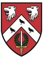 Arms: Gules, on a chevron between in chief two lions heads erased argent, and in base a sword of the second pummelled and hilt or and enfiled with a wreath of laurel, three ravens, all proper