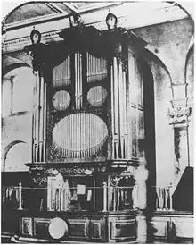 The present organ's oak case is the same one made to enclose the organ that was built for St Clement's in 1696 by Renatus Harris[16] who maintained the instrument until 1704.[17] While the case has remained largely intact, the organ itself has been variously rebuilt and restored; in 1704 by Christian Smith, and in 1711 by Abraham Jordan (c.1666–1716)—who it is thought added the swell organ to the two manual instrument. From 1838 the organ was in the care of Messrs Gray and Davison, who in 1872—as part of the renovation of the building—moved the organ from the west gallery to the south aisle. Care of the organ was transferred to Henry Wedlake that same year. In 1889 he rebuilt the instrument. Further work was undertaken in 1926 by Messrs J. W. Walker, and in 1936 by Messrs Hill, Norman and Beard, whew the instrument was moved back to an approximation of its original west-end location. The same company overhauled the organ in 1946, and in 1971 made 'neo-baroque' tonal revisions, which remain to this day. The instrument was last cleaned and repaired in 2004 by Colin Jilks of Sittingbourne, Kent.