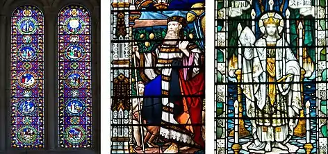 The "Seven Churches" window in the north-west corner of the church was given by Emily Alicia Morrell of Headington Hill Hall in memory of her late husband, George Herbert Morrell, MP (1845-1906). It is based on Christ's letters to the Seven Churches of Asia in Revelation (1:12–3:22). The subject is unusual, and suggests a deliberate choice by Mrs Morrell of a Bible passage of particular relevance to her or her family.[24] The window is of painted glass and was installed in 1908. It was designed by Powell & Sons of Whitefriars Glassworks, London. Powell was closely associated with William Morris and the Arts and Crafts movement.[25] This influence is clearly apparent from features such as the use of red wings for angels.[24]