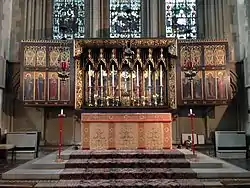 Historic England, recording St Giles' Grade II*-listed status, describes it as being "of outstanding quality by virtue of its collection of medieval and C18 survivals, together with C19 fittings by many of England's leading church decorators".[1] The interior was decorated in the style favoured by the Oxford Revival,[15] with Sir Charles Kempe and Sir Ninian Comper commissioned to provide much of the design work,[16] and the church still houses works after Michelangelo and a copy of Chatsworth House version of the Adoration of the Magi by Paolo Veronese. Much of the wood carvings were supplied in the late 19th century by Bavarian wood-carvers from Oberammergau. The early-18th-century altar rails came from the English Church in Rotterdam.