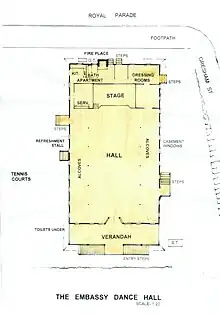 The Embassy Dance Hall, and then the Ambassador Theatre, occupied the same building at different periods. It was located on the west corner of Gresham Street and Royal Parade, St John's Wood.[36] Construction occurred in 1928 and was built for Frank Fraser Ltd.[37] It was an all timber structure of 33.5m x 17m with a 6.5m ceiling height. Entry was from the Enoggera Creek end via a twin flight of stairs to a wide verandah. The Hall had side alcoves, a raised stage, two change rooms, a small apartment and a side refreshment counter. Male and female toilets were under the building at the creek end.[38]