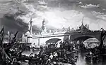 Until 1831 the bridge was aligned with Fish Street Hill, so the main entrance into the City from the south passed the West door of St Magnus on the north bank of the river.[64] The bridge included a chapel dedicated to St Thomas Becket[65] for the use of pilgrims journeying to Canterbury Cathedral to visit his tomb.[66] The chapel and about two thirds of the bridge were in the parish of St Magnus. After some years of rivalry a dispute arose between the church and the chapel over the offerings given to the chapel by the pilgrims. The matter was resolved by the brethren of the chapel making an annual contribution to St Magnus.[67] At the Reformation the chapel was turned into a house and later a warehouse, the latter being demolished in 1757–58.