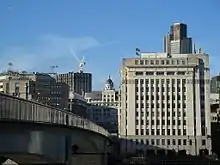 Depictions of St Magnus after the building of the new bridge, seen behind Fresh Wharf and the new London Bridge Wharf, include paintings by W. Fenoulhet in 1841 and by Charles Ginner in 1913.[177] This prospect was affected in 1924 by the building of Adelaide House to a design by John James Burnet,[178] The Times commenting that "the new ‘architectural Matterhorn’ ... conceals all but the tip of the church spire".[179] There was, however, an excellent view of the church for a few years between the demolition of Adelaide Buildings and the erection of its replacement.[180] Adelaide House is now listed.[181] Regis House, on the site of the abandoned King William Street terminus of the City & South London Railway (subsequently the Northern Line),[182] and the Steam Packet Inn, on the corner of Lower Thames Street and Fish Street Hill,[183] were developed in 1931.[184]