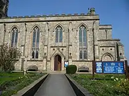 The earliest record of a church on the site is in 1122, when it was granted to Pontefract Priory.[2] The tower and east window of the present church date from the 15th century. The rest of the church was rebuilt by Thomas Rickman and Henry Hutchinson in 1828–29. In 1844 an additional stage and the spire were added to the tower.[3] The church was restored in 1881 by the Lancaster architects Paley and Austin.[4] In 1898 the timber roof and clerestory were added by Frederick Robinson.[3] In 1913, the west gallery was removed. This had contained the original organ made by Samuel Renn in 1834, which was moved elsewhere, possibly to Chester. The new organ, made by J. J. Binns, was sited at the east end of the church.[5] In 2008 a piece of the spire fell off and it was discovered that the spire was crumbling, and in 2010 an appeal was launched to raise money for its repair.[6]