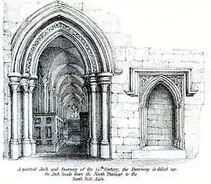 A refectory was constructed in the old south porch of the church moving the main entrance to one on the south transept.[1]