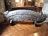In the south chancel aisle is an excellent 10th century Viking hogback stone which is covered in carvings of wolves, deer, and men on one side, and, on the other side, of a man next to a large tree with animals. It appears to be red sandstone and measures over six feet long, around a foot wide, and in the middle about 2 ft tall. Ewing (2003) reports a variety of interpretations of the images, including H. C. March's that the carvings are a representation of the poem Völuspá and the victory of Christianity over paganism. It also includes Edwards' (1998) claim that the meaning of the carvings is unknown.[3][6][7][8]