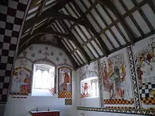 Prior to the removal of the church, wall paintings were discovered showing through in places beneath the plaster.[5] When the church began to be dismantled, the paintings were first removed and preserved; the oldest of them was a mural of St Catherine, believed to date from the 15th century.[6]