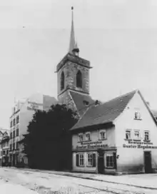 The Old St Thomas' Church was a Gothic aisleless church on the junction of Löberstraße and Rosengasse streets and served as the Protestant parish church of the Löbervorstadt district until its demolition in 1903. The parish extended between the inner and outer city walls in the south of Erfurt until it was defortified in 1872. During the Middle Ages, this area was mainly inhabited by poorer people, such as day labourers, porters as well as the Löber people, who practised the craft of tanning and gave the district its name. For this reason, the Old St Thomas' Church was one of the smallest church buildings in the city with simple architecture and only a few precious inventory items, such as the carved altar from 1445. The Old St Thomas' Church was first mentioned in writing in a document in 1282. It was probably rebuilt in the Gothic style in the first half of the 14th century. It remained in this form until it was demolished, making it one of the very few churches in Erfurt that did not undergo any major structural changes, either as a result of city fires or due to dilapidation. After Erfurt was defortified in 1872, the Löbervorstadt district moved southwards, whereupon numerous new residential buildings were erected between the Flutgraben ditch and the Steigerwald forest from 1890 onwards, and the Old St Thomas' Church no longer offered enough space for the growing congregation. In addition, many wealthy citizens settled in the quarter, who wished for a more representative and centrally located parish church. In this way, St Thomas' parish had developed from what was once the smallest and poorest to one of the largest and richest parishes in Erfurt.