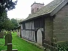There is evidence of a Saxon church on the site before the Norman Conquest.[7] In 1187–90 Adam de Dutton founded a priory on the site for Norbertine canons but this was short-lived and there is now no trace of the priory. It is likely that the building of the present church began in the middle of the 13th century. Towards the end of the 16th century, the chancel area was remodelled and a pulpit, altar rails and communion table were installed. In 1645 the church was extensively altered and extended. The south and west walls of the nave were rebuilt and the roof of the nave was lowered. A small chapel and vestry with a stone foundation and timber framed wall were added to the south side of the chancel, while a stone extension was added to the north side. In 1711 the east end of the chancel was rebuilt and a brick tower was added at the east end of the church. In 1722 a gallery was built. Wooden floors were installed in 1813, the vestry was incorporated into the church and a new vestry was built onto the south side of the tower. In 1857 the chancel floor was tiled, the walls were painted with medieval designs and the timber supports and the chancel ceiling were plastered. Stained glass was added to windows and the gallery was removed. By 1880 the church needed major repairs, and because of this the new church was built and the old church ceased to be the parish church. Repairs were undertaken in 1894 for dry rot, in 1927 for death watch beetle and in 1958, again for death watch beetle. In 1971 the church passed into the care of the Redundant Churches Fund, the predecessor of the Churches Conservation Trust.[8][9]