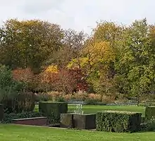 Today the park retains its original design, broadly patterned upon an English landscape park, with an elongated axis, wide curving paths, lawns, and numerous trees, as well as a meadow flooded for ice-skating in the winter. The botanical garden is laid out as a display garden, with geometric pools, arcades, and high hornbeam hedges. The orchard contains a number of heritage fruit varieties including Westfälischer Gülderling and Schöner aus Wiedenbrück.
