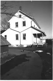 West of the house are three small outbuildings. They are the food drying house, the bake oven, and the smoke house. Each is a frame structure with a front gable roof and wood shingles.[2] The food-drying house has beveled horizontal siding. There are shallow drawers for the food to be dried.[2] The smokehouse and bake oven have vertical wood siding. All three buildings appear to be from about 1900.[2]