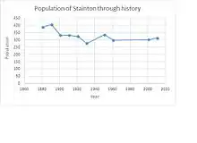 This is a chart showing the population statistics for Stainton between 1881 and 2011 received from census data. In 1941, there was no census so no recorded data. Over time, there have not been any substantial fluctuations in the data and the population seems to have kept at a steady rate. In 1881 the recorded population was 388 and the most recent record was 313.[10][1][11] The lack of major fluctuations could suggest that the boundary of the parish hasn't moved over the years and there have been no major inputs and outputs into the village. Peter Wood states that in the past "people rarely moved far away and were often related to each other"[12] which could be the reason for such a stable trend.