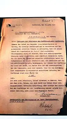 The camp was liberated on 29 April 1945 by the British Armed Forces of XXX Corps following fighting with the German 15th Panzergrenadier-Division. The camp commandant, however, realizing that the end of the war was close, had already agreed to hand over control of the camp to the prisoners, led by the French Colonel Marcel Albert. On 21 April, the same day that the officer ordered to take control of the camp complained to his superiors about conditions there (see picture), two prisoners carried the call for assistance from the camp to the Guards Armoured Division at Zeven. Two armoured units were sent to Sandbostel but fighting delayed their arrival until 29 April.[6]