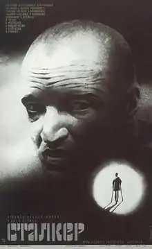 Stalker (Russian: Сталкер, IPA: [ˈstaɫkʲɪr]) is a 1979 Soviet science fiction art film directed by Andrei Tarkovsky with a screenplay written by Arkady and Boris Strugatsky, loosely based on their 1972 novel Roadside Picnic. The film tells the story of an expedition led by a figure known as the "Stalker" (Alexander Kaidanovsky), who guides his two clients—a melancholic writer (Anatoly Solonitsyn) seeking inspiration, and a professor (Nikolai Grinko) seeking scientific discovery—through a hazardous wasteland to a mysterious restricted site known simply as the "Zone", where there supposedly exists a room which grants a person's innermost desires. The film combines elements of science fiction with dramatic philosophical, psychological and theological themes.[5]