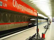 The four stations Olympiazentrum, Petuelring, Scheidplatz and Bonner Platz, are all made of exposed concrete with reliefs on the walls, while the orange color for the U3 is reflected in the line band and other architecture in the station. They deviate in form and design quite strongly from the basic form of the, only shortly before planned and executed stations of the U6, - due to the Olympic decision and the associated reputation justifying an independent appearance of the stations.