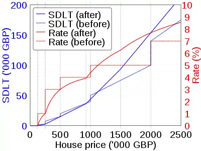 In the 2014 Autumn Statement, Chancellor George Osborne announced reform to Stamp Duty to remove the slab element - stamp duty is now paid on the amount above certain thresholds rather than one rate on the total amount which depends on the amount, as detailed in the section above.[25] This change was beneficial for 98% of property purchases[26] but caused a collapse in sales at the upper end of the market.[27][28]