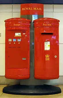 The K4 (or Kiosk No. 4) design of the classic British red telephone box, introduced in 1925, incorporated a stamp vending machine.[1] Five of the original fifty K4s remain standing today and was described as an "automated mini-Post Office".[2]