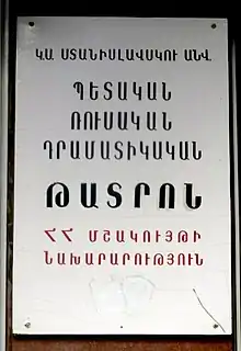 Officially State Russian Drama Theatre named after Konstantin Stanislavski (Armenian: Կոնստանտին Ստանիսլավսկու անվան ռուսական պետական դրամատիկական թատրոն), more commonly Stanislavski Russian Theatre, is a state theatre in the Armenian capital of Yerevan located on Abovyan Street in the central Kentron district of the city, next to Charles Aznavour Square. It was opened in 1937 and named after the Russian actor and theatre director Constantin Stanislavski since 1938. The theatre director is Alexander Grigoryan since 1965.